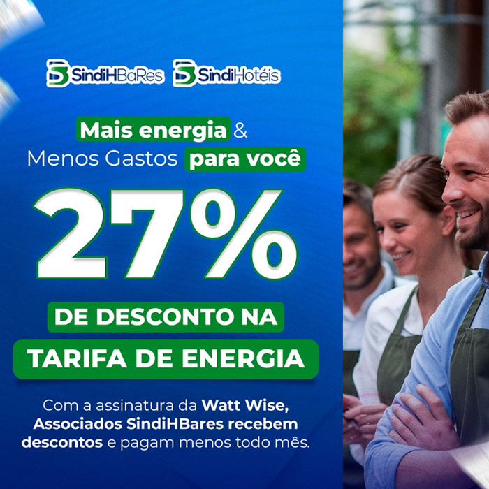 Watt Wise – Mais energia e menos gastos para você Com a assinatura gratuita da Watt Wise, os associados SindiHBaRes / SindHotéis recebem descontos de 27% na tarifa de energia. Entre em contato com a representante comercial ou acesse o link: Gabriela – (31) 97221-1075 https://www.wattwise.app.br/Convida/sindicatodehoteisrestaurantebaresesimilaresbh